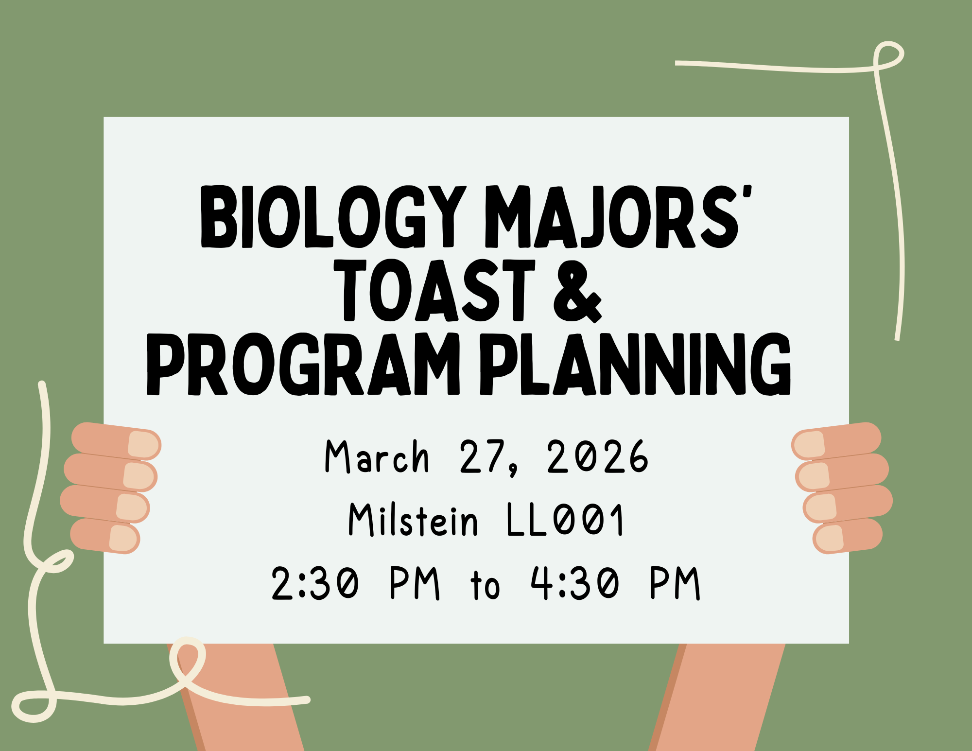 Drop by the biology department program planning meeting to learn about Fall 2026 course offerings and upcoming job openings. Afterwards, stay to celebrate our new and graduating biology majors at the annual majors' toast.
